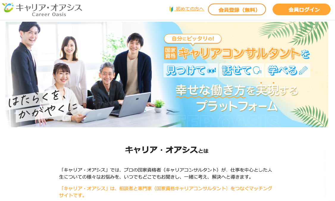 「キャリア・オアシス」は、仕事やキャリアに関する悩みを持つ人と、国家資格を持つキャリアコンサルタントをつなぐオンラインのマッチングサービスです。利用者は、自分の悩みやテーマに合った専門家を選び、転職相談、自己分析、職場の人間関係、将来のキャリア設計など、仕事を中心とした人生の課題について相談することができます。場所や時間にとらわれず相談できるため、気軽に専門家の支援を受けられるのが特徴のキャリア支援サービスです。また、キャリアコンサルタントが講師となった各種セミナー(国家試験の受験対策セミナーを含む)を多数掲載しています。