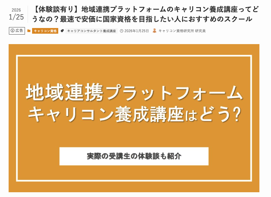 キャリコン資格研究所のWebサイトにて、地域連携プラットフォームのキャリアコンサルタント養成講座が紹介されました。